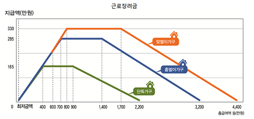 근로장려금은 가구원 구성에 따라 정한 부부합산 총급여액 등을 기준으로 지급액을 산정합니다.