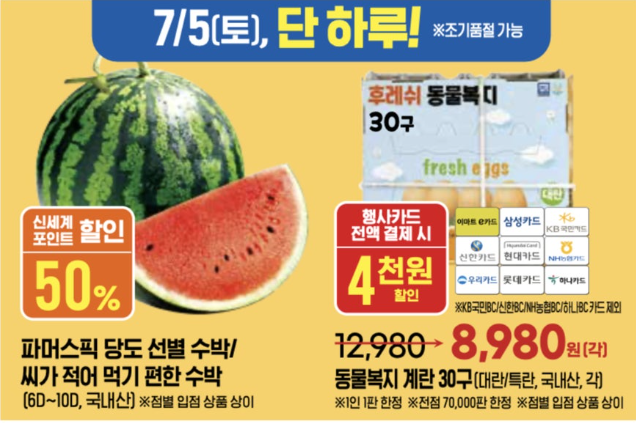 수박도 반값이다. 이마트는 오는 5일 '파머스픽 당도선별수박(8㎏미만)'을 정상가 2만1900원에서 1만950원으로 할인 판매하는 등 '파머스픽 당도선별수박', '씨가 적어 먹기 편한 수박' 모든 품목을 신세계포인트 적립 시 50% 할인한다.