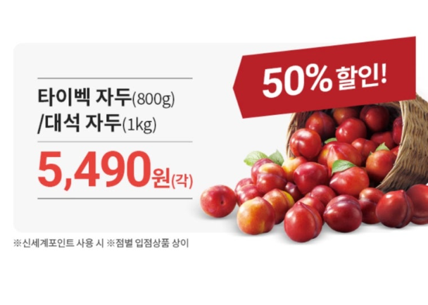 이외에도 4일은 복숭아를, 4일~6일 '타이백자두(800g)', '대석자두(1㎏)'를 신세계포인트 적립 시 50% 할인판매한다.