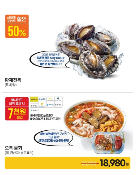 이외에도 광어, 강도다리, 송어, 전복, 멍게 등 국산 해산물로 구성된 '오복물회(팩)'를 행사카드 전액 결제 시 2만5980원에서 7000원 할인한 1만8980원에 구매할 수 있다.